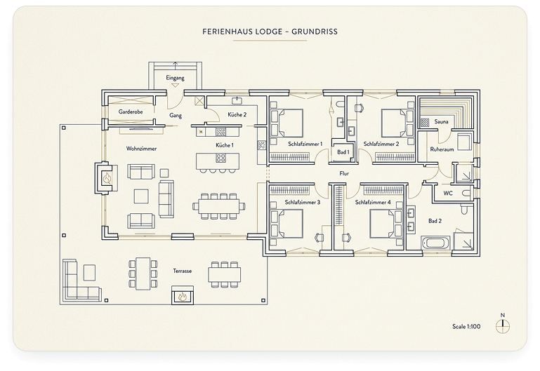Vier Schlafzimmer, zwei Küchen, ein offener Wohnbereich mit Kamin und ein Spa-Flügel mit Sauna — ein Haus, das auch zu acht nie eng wird. Ebenerdig konzipiert und barrierearm zugänglich.